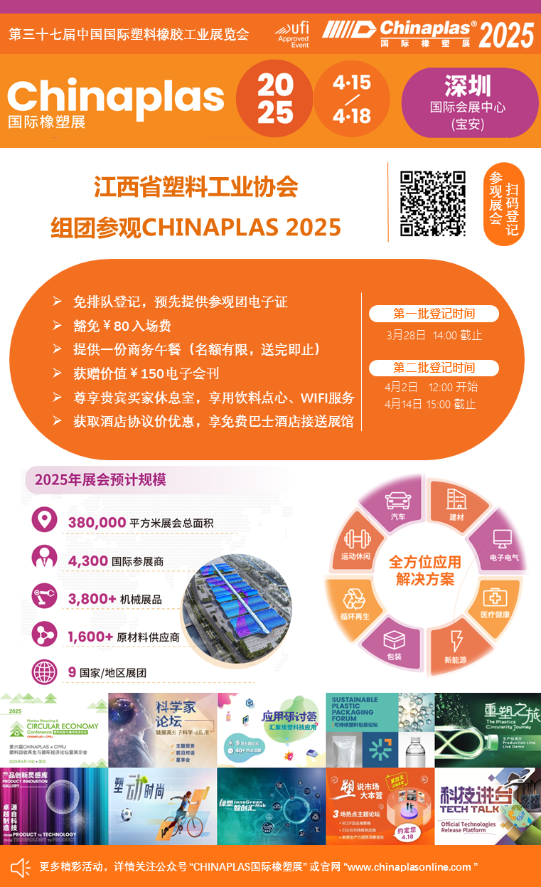 江西省塑料工业协会作为本次展会的支持单位,将组织邀约会员单位及行业同仁组团参观,您将与全球行业精英面对面交流,洞悉行业发展趋势,把握市场先机!一站式了解最新技术、设备和材料,助力企业转型升级!第一批报名登记时间截止:2025年03月28日(14:00)截止第二批报名登记时间截止:2025年04月02日(12:00)—04月14日(15:00)截止请有意向参观的单位于上述时间内扫描下方图片报名二维码,让我们相约深圳,共襄行业盛举,共创美好未来!